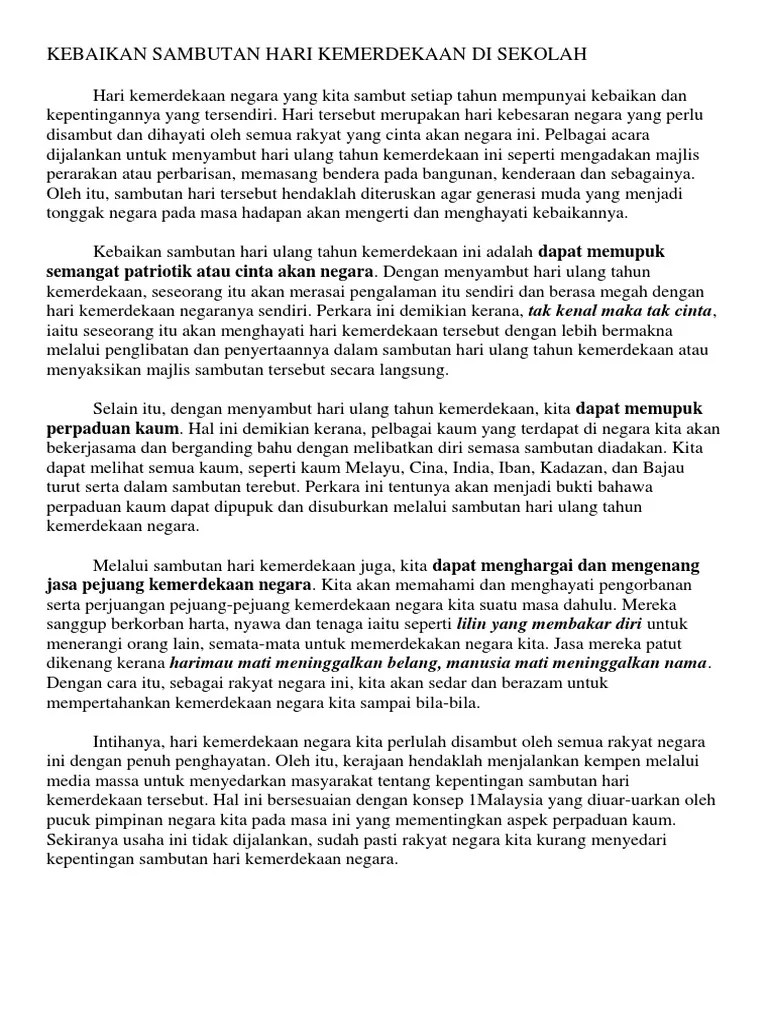 Berikut dikongsikan dua contoh karangan spm berkaitan pentingnya sambutan bulan kemerdekaan dan hari malaysia kepada rakyat malaysia yang . Contoh karangan pentingnya sambutan hari kebangsaan untuk mengukuhkan jati diri dan perpaduan kaum. Tanah air kita merupakan salah sebuah negara yang kian pesat membangun di rantau asia. Hari malaysia yang diraikan pada 16 september tidak kurang pentingnya dengan sambutan hari kemerdekaan yang perlu dijiwai oleh seluruh rakyat. Kepentingan sambutan hari kemerdekaan di sekolah. Perayaan hari kemerdekaan negara kita disambut pada tanggal 31 ogossetiap tahun. Antara kepentingan menyambut hari kemerdekaan negara ialah dapat memperhebat jati diri rakyat malaysia agar menghargai kemerdekaan yang telah dikecapi. Kepentingan sambutan hari kemerdekaan · sambutan hari malaysia psk kemerdekaan · kepentingan sambutan kemerdekaan · karangan kemerdekaan · kepentingan menyambut . Kepentingan sambutan hari kemerdekaan englshgris. Pelbagai acara dijalankan untuk menyambut hari ulang tahun kemerdekaan ini seperti mengadakan majlis perarakan atau perbarisan memasang bendera pada bangunan .
